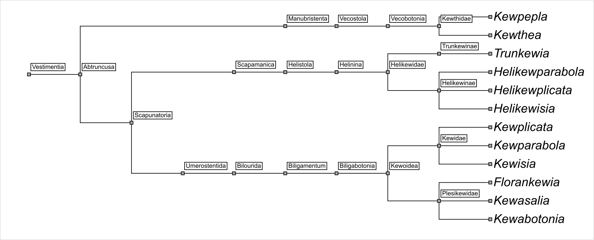 The family Kewidae is designated as the sensu stricto taxon for Kewoidea; its three genera encompass the three skirt options available for the Kew. However, only Kewisia (straight skirt) is populated with taxa; the other two have yet to see any species.